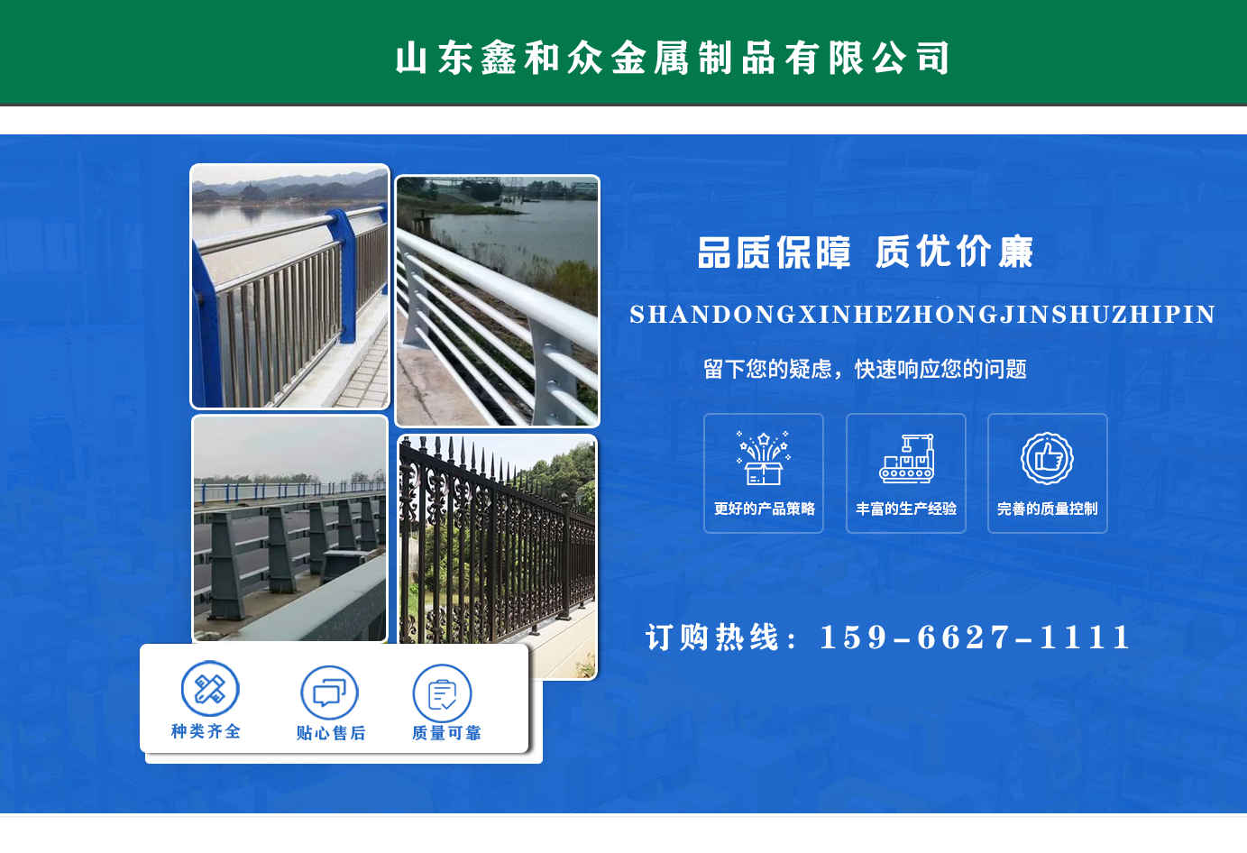 山東鑫和眾金屬制品有限公司主要產(chǎn)品有防撞護欄,橋梁護欄,道路護欄,河道護欄,不銹鋼護欄等護欄。提供設計方案,一站式定制,包您滿意價格優(yōu)惠,歡迎來電咨詢! 公司常年從事銷售護欄防撞護欄,橋梁護欄,道路護欄,河道護欄,不銹鋼護欄,橋梁鋼護欄,河道燈光護欄等。產(chǎn)品廣泛應用于橋梁、河道、旅游景區(qū)、道路、公路、公園、小區(qū)、景觀、道路防撞等領域?! 」井a(chǎn)品均采用優(yōu)質(zhì)不銹鋼材料,符合相關(guān)標準。各種型號不銹鋼復合管及護欄,質(zhì)量嚴格把控。產(chǎn)品強度高、耐腐蝕、焊接牢固、抗沖擊、性能好,防撞護欄結(jié)構(gòu)簡單、美觀實用大方?! g迎前來訂購!...